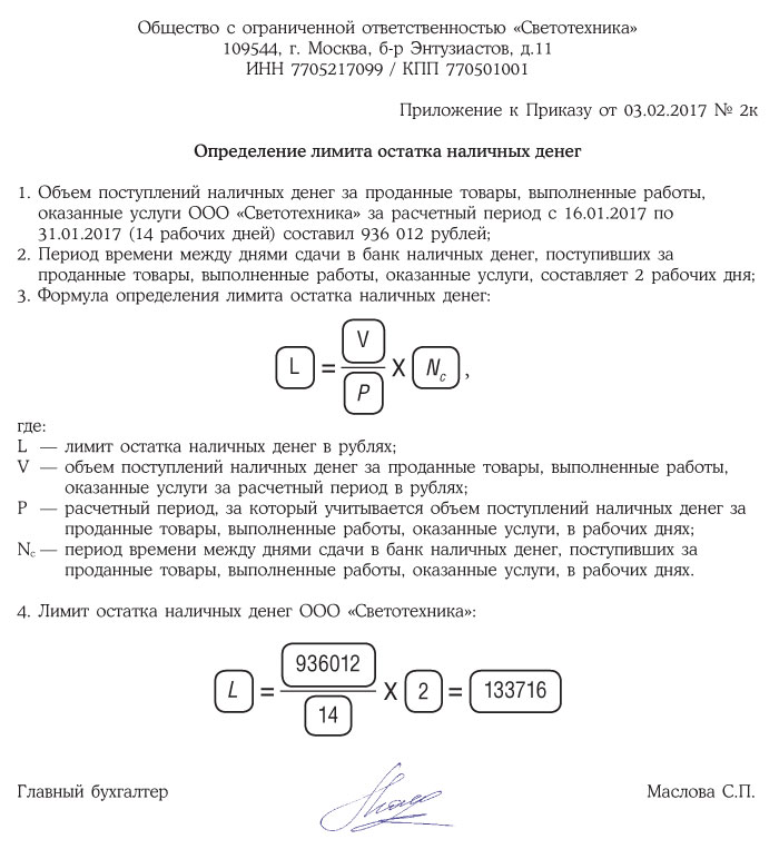 Порядок расчета лимита кассы может быть как указан в качестве приложения к приказу, так и приведен в самом организационно-распорядительном документе организации.