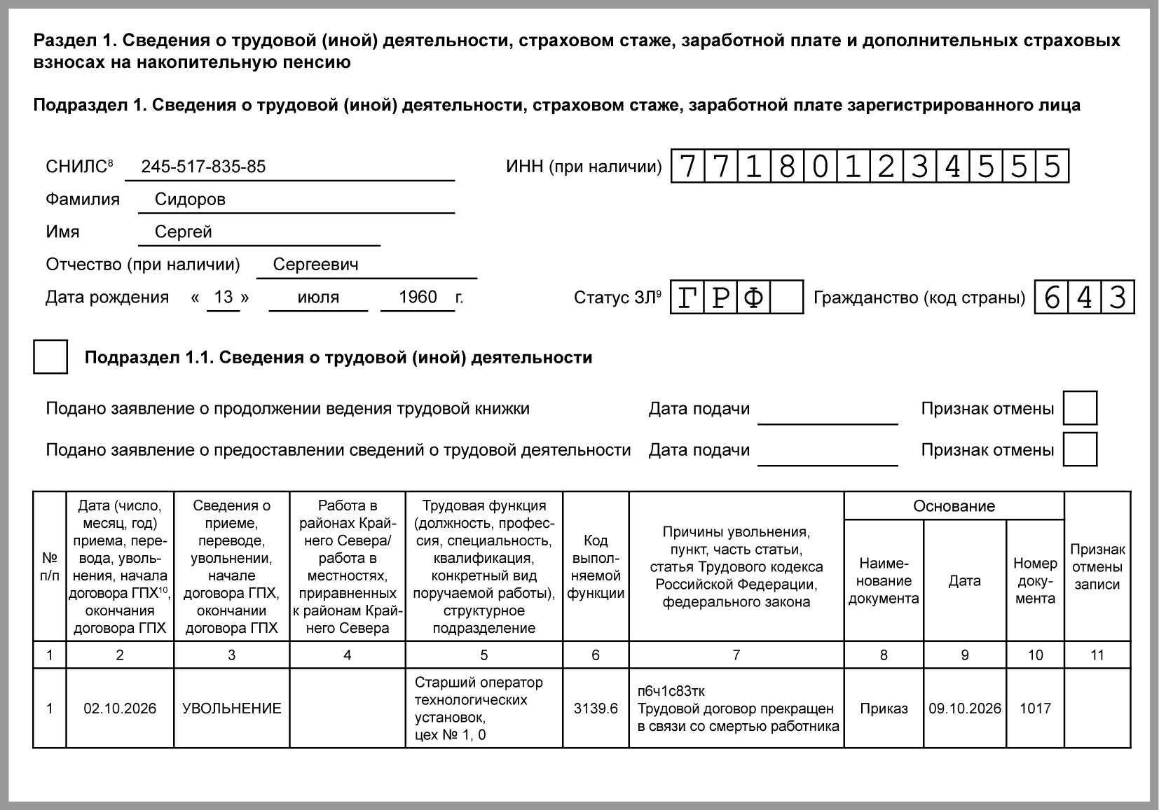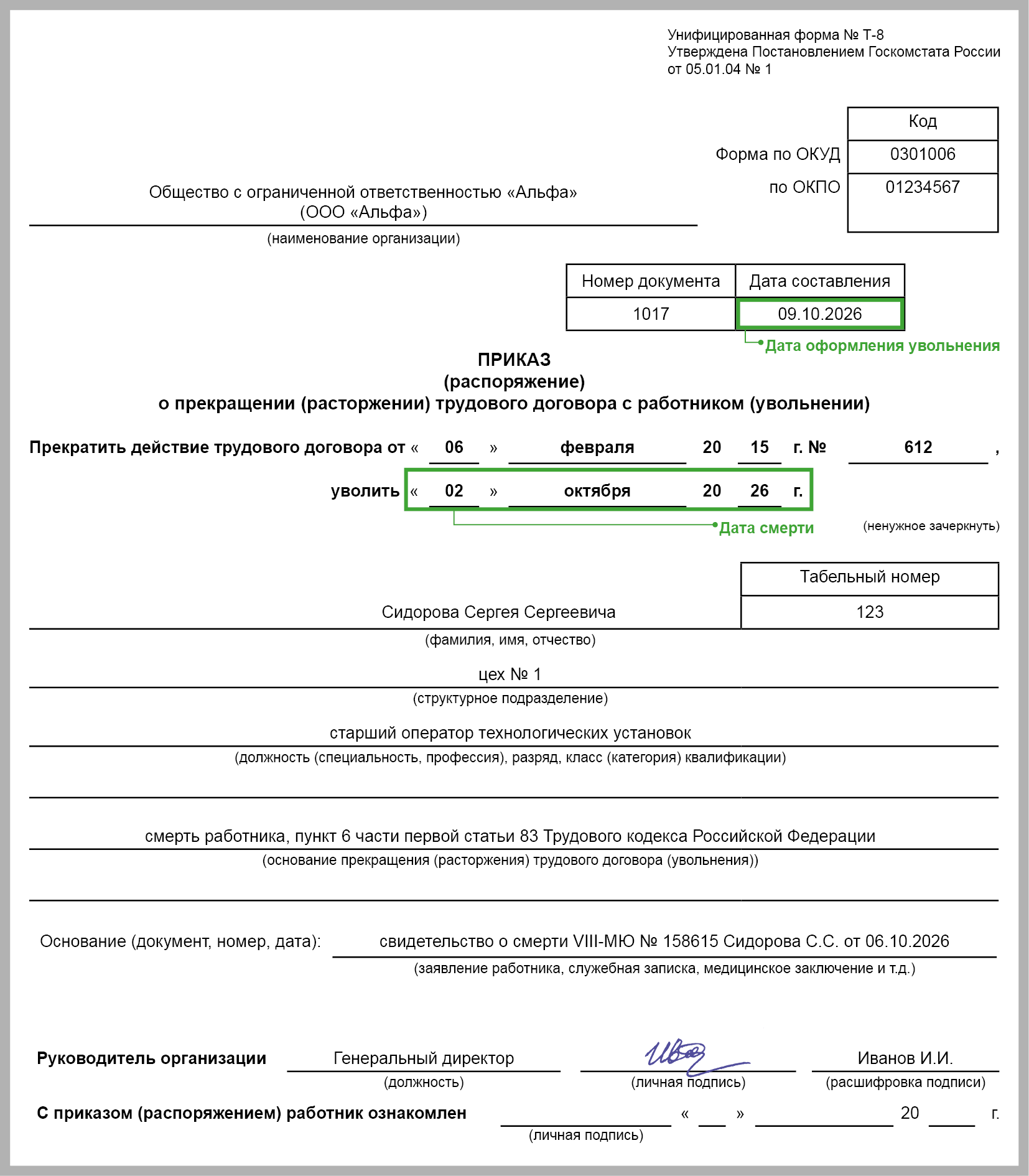 Дата увольнения умершего работника - день его смерти. Если у вас нет копии свидетельства о смерти, вы можете получить повторное свидетельство, подав заявление в ЗАГС или МФЦ (п. п. 1, 2, 5 ст. 9 Закона N 143-ФЗ).