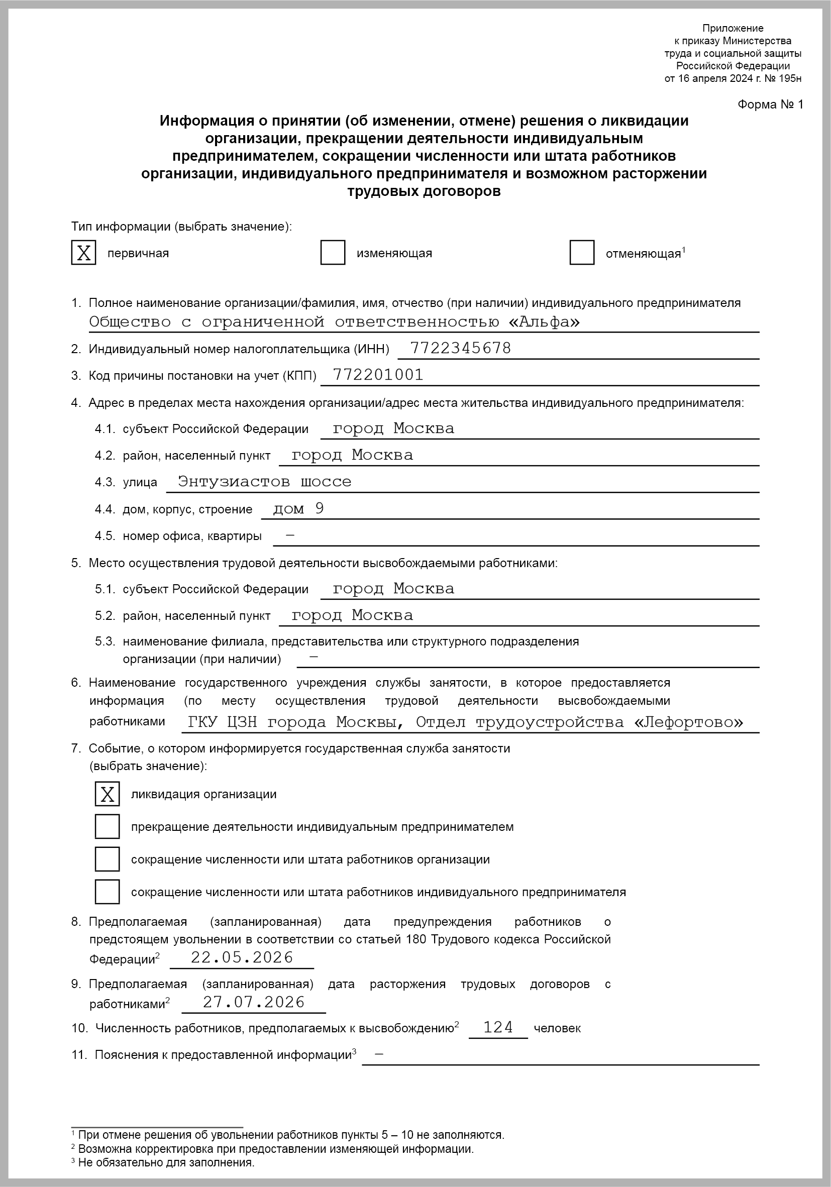 Уведомление об увольнении в связи с ликвидациейООО "Альфа"