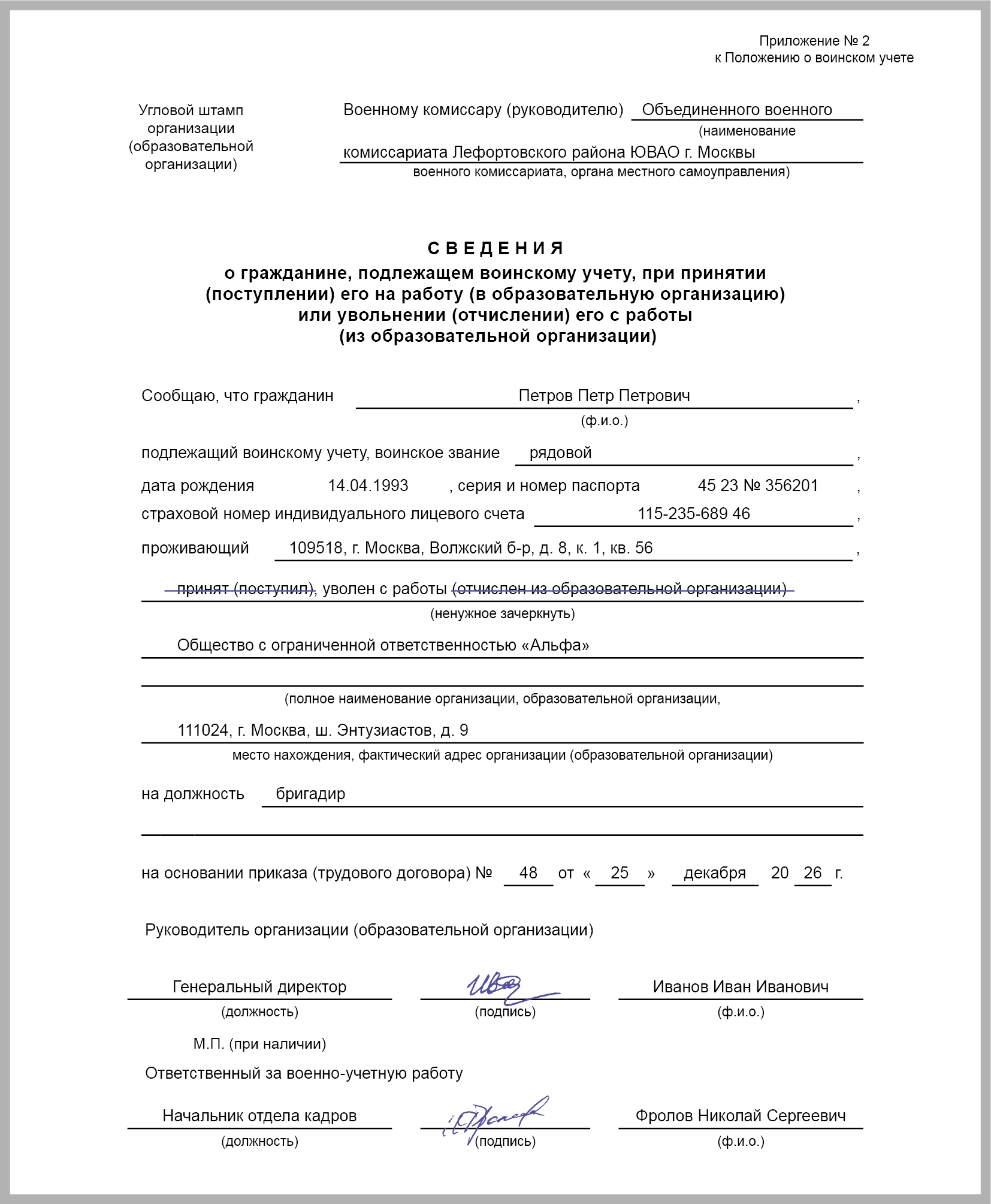 При приеме на работу и увольнении военнообязанного или призывника не позднее 5 дней подайте в военкомат по месту его регистрации сведения о нем (ст. 4 Закона о военной службе, Письмо Минобороны от 06.10.2023 N 207/6/3665).