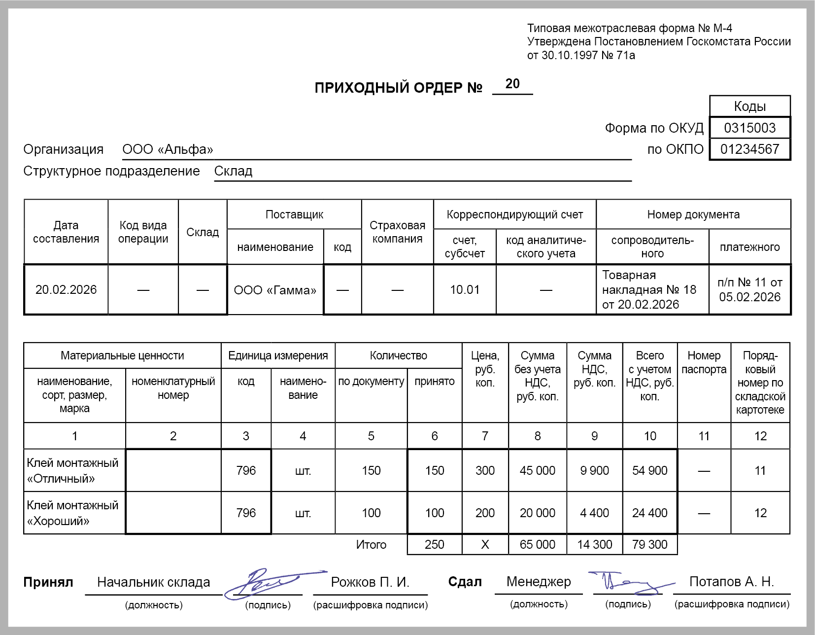 Материалы принимают к учету на основании документов, полученных от поставщиков. Бухгалтерская программа при этом формирует приходный ордер М-4. В первоначальную стоимость кроме цены по договору в бухгалтерском и налоговом учете включают расходы на доставку и другие ТЗР (п. 11 ФСБУ 5/2019, ст. 254 НК РФ).